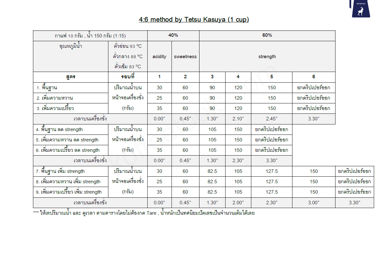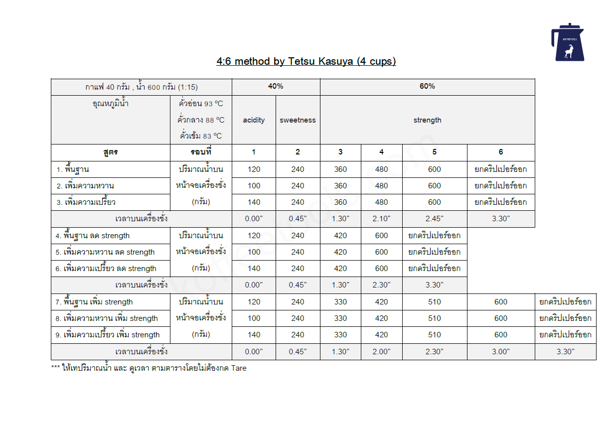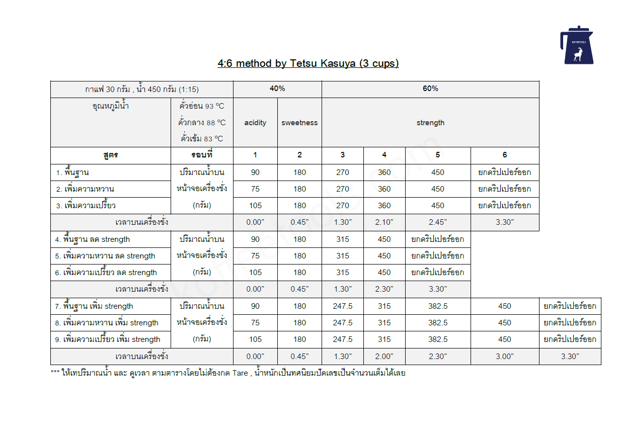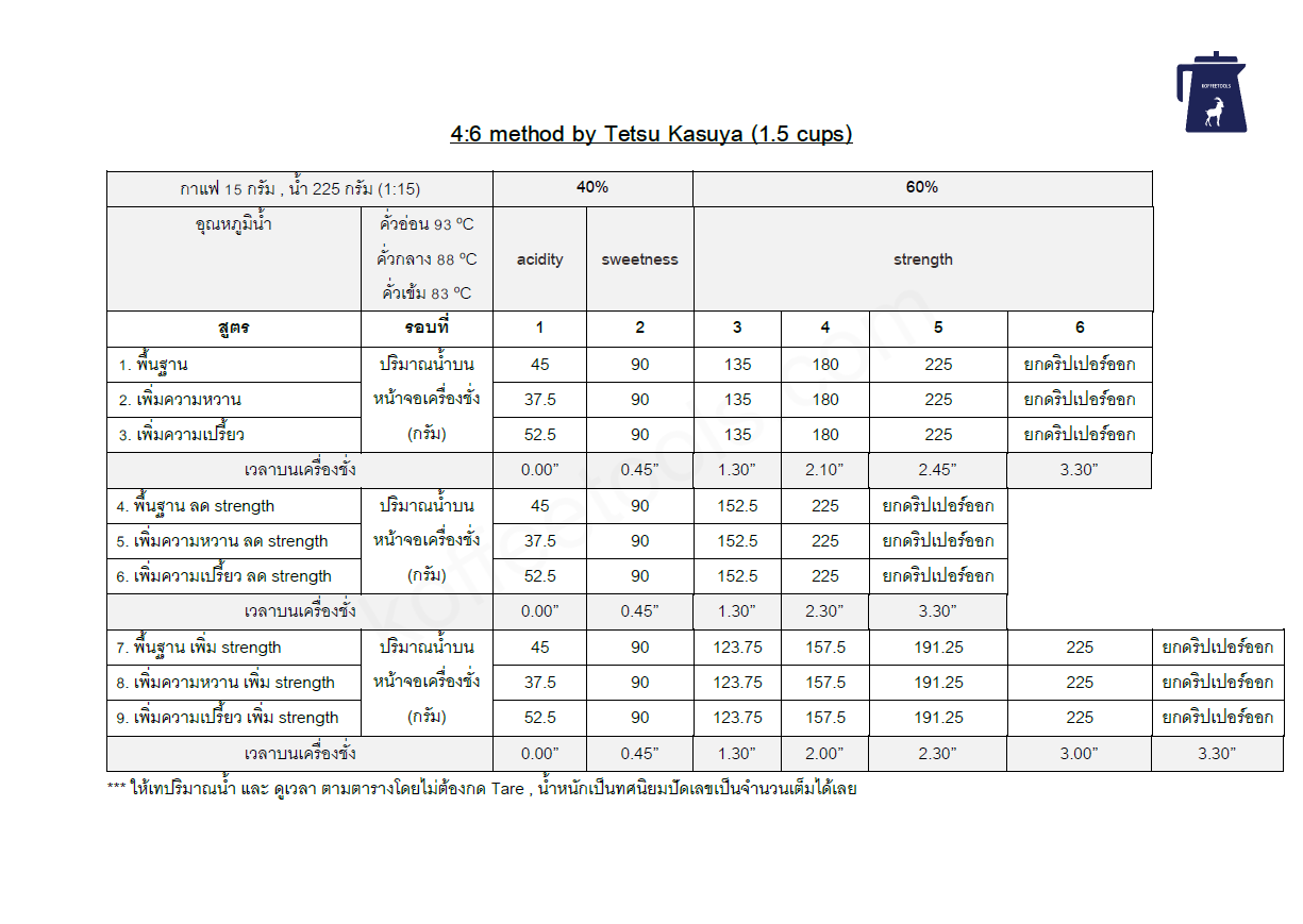 ตารางสรุปวิธีการชงกาแฟ 4 : 6 method
