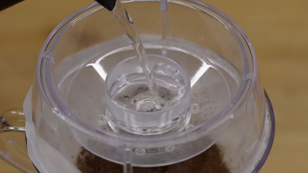 - สามารถเทน้ำตรงขอบให้ล้นมาใส่ตรงกลางบางส่วน เพื่อเพิ่มการกระแทกผงกาแฟได้ (เพิ่ม turbulance)